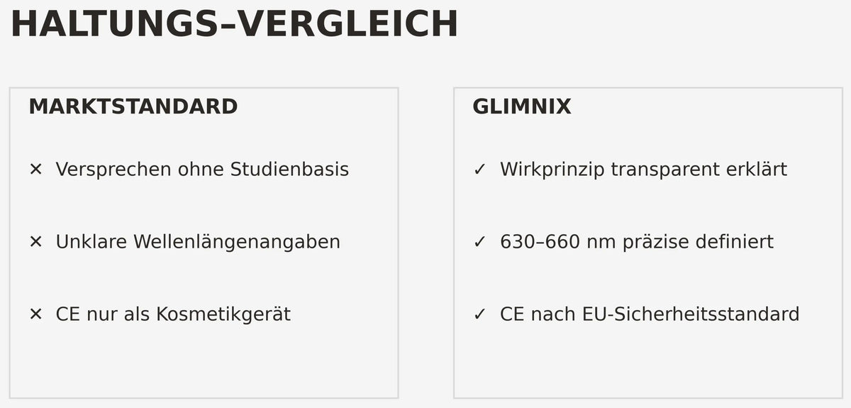 Auf dem deutschen Markt fehlte ein LED-Gerät, das seine Wirkung erklärt und belegt. Glimnix wurde gegründet, um diese Lücke zu schließen – mit CE-zertifizierten Geräten und offenem Wirkprinzip.